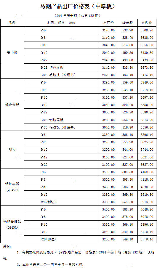 马钢10月份中厚板出厂价格